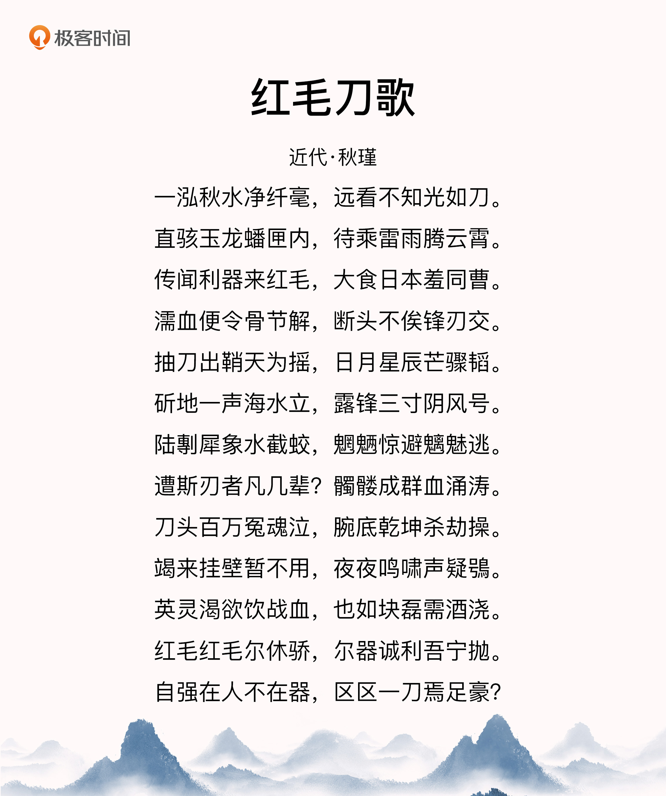 这是我们这个专栏的最后一讲了。我选了一首比较长,时间上也离我们比较近的诗,秋瑾留学日本时写的《红毛刀歌》。