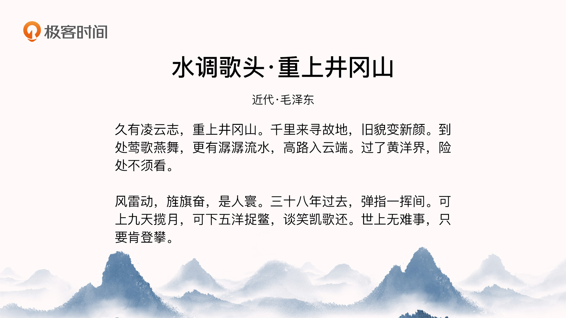 讲到这里今天正课就讲完了,因为提到了伟人毛主席,所以今天的煮酒论诗,我特别想分享一下他的诗词。我们都知道,毛主席除了是伟大的政治家、军事家以外,他也是位杰出的诗人。我选了他的《水调歌头·重上井冈山》: