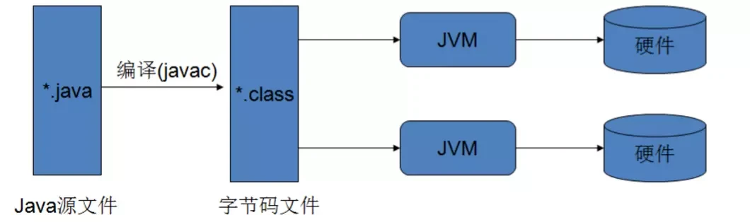 使用java解释器将.class字节码文件翻译成机器代码,执行。.class字节码文件与环境及操作系统无关。