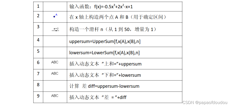 在国外的专业教材上,采用的是和国内等价,但是略有不同表述的方式定义定积分的。就是,对于任意划分,以子区间的上确界作黎曼和做为达布上和,以下确界作黎曼和作为达布下和,如果所有达布上和的下确界等于所有达布下和的上确界,那么就称此界限为该函数的定积分。