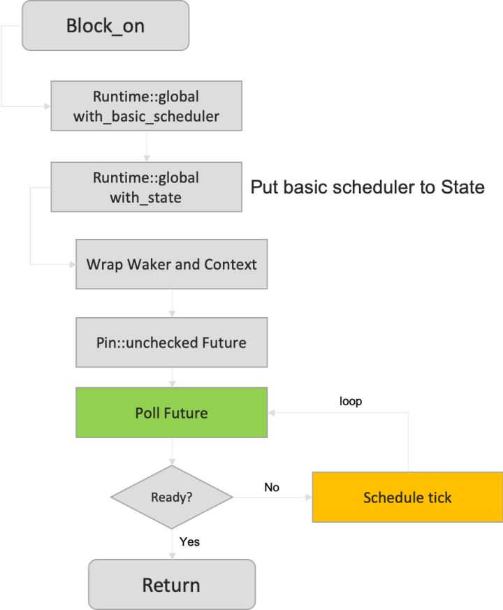 上面说过,tokio::main 是启动了 runtime::block_on , 然后把 async 后面的内容作为一个 Future 传给 block_on Block_on , 如果是 Basic Schedule ,则按照 Basic Schedule 开始循环执行 Future.poll 。 流程如下: