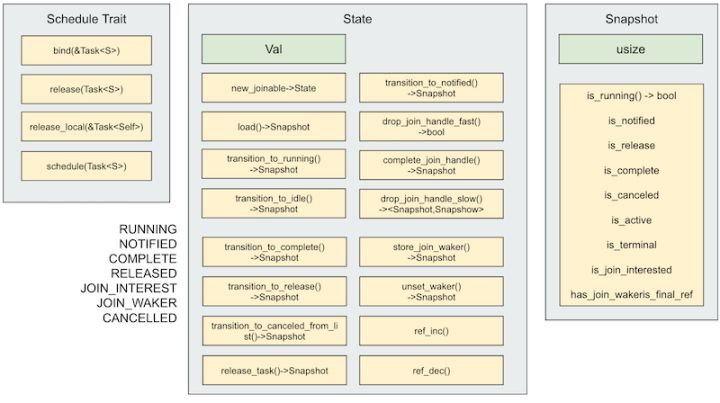 以上内容基本描述了 Scheduler 的流程。但是还有很多地方不清晰,因为我们还有两个重要的内容没描述:Park 和 Task 。Park 是在 Waker 基础上的增强,针对线程状态和 Future 做更细节的管理和控制; Task 是连接 Future 和 线程模型的重要控制模块。也可以说是 Rust 异步模式之后开发时接触最多的概念。按照 Aaron Turon 的定义, Task 是正在执行的 Future ( a task is a future thas is being executed)