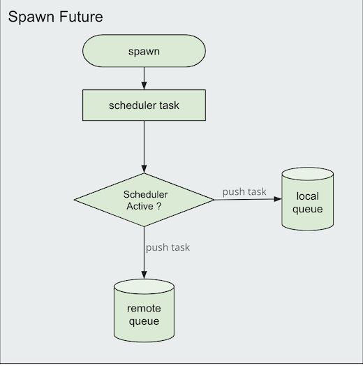 启动一个任务,然后判断是不是有 Scheduler 存在。有的话,就 push future 到 Local 的任务队列,没有就 push 到 remote 的队列。