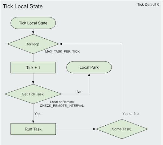 LocalState 包含两个比较重要的点, tick 和 park。Park 是针对 Waker 的再次封装,为了能够更好控制线程,这个我们后面单独解释。 tick 是针对 task state 的增强,一次 tick 可能包含很多次 task 。例如在读取 socket 的时候,可以执行很多 task ,每个 task 读取一小段数据,执行多次,读完整个数据。在 basic_scheduler 里面,MAX_TASKS_PER_TICK 默认设置为 61