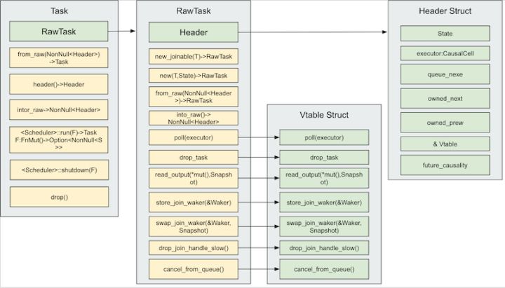 - RawWakerVTable : 是一个虚函数指针表(Virtual Function Pointer Table, vtable),指向 RawWaker 对象的指针的列表