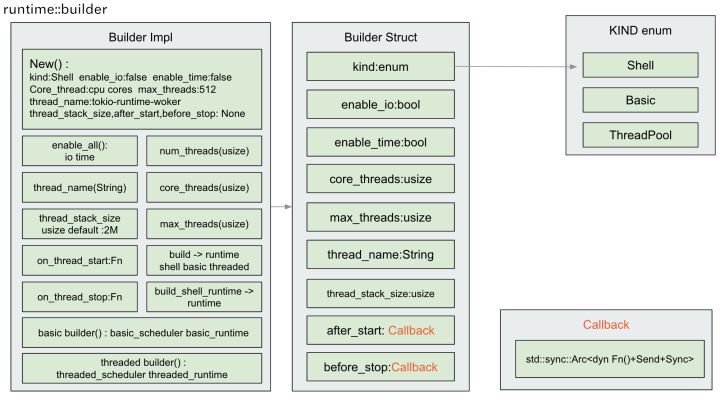 builder 有两组 threads,一组是 core_threads,默认是和 CPU 的核数一样。一组是 max_threads , 默认是512 。Core_threads 是作为 tokio runtime 的主要 executor。max_thread 是作为 blocking_pool 的 executor。在 runtime 启动的时候,core_threads 和 blocking_thread 都启动。在运行 Future 的时候,tokio::spawn ,在 core_threads 运行; tokio::block_on ,在 blocking_thread 启动。当然两种情况线程调度的机制都不一样