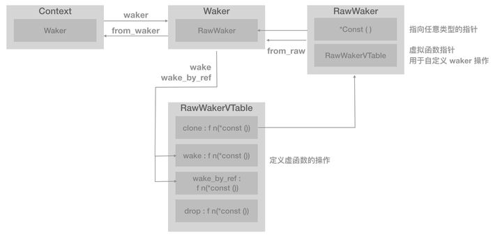 Context 结构里面定义一个 Waker,实现了和 Waker 的相互转换。RawWaker 定义了一个指向任何数据类型的指针,和虚函数表,用来实现和虚函数的绑定、RawWakerVTable 定义了虚函数的几种操作,其中wake 和 wake_by_ref 和Waker 的实例对应