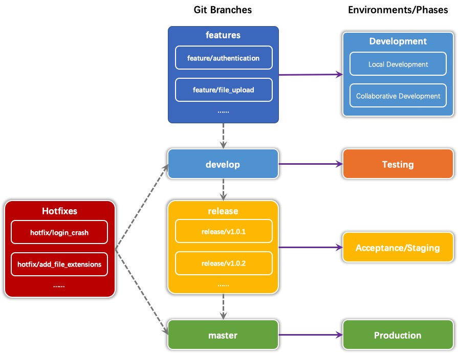这里说的Acceptance,即验收环境,就是对应着大家所熟悉的Staging(演示环境)。所以,可以按自己团队的风格,将这个缩写改为DTSP。