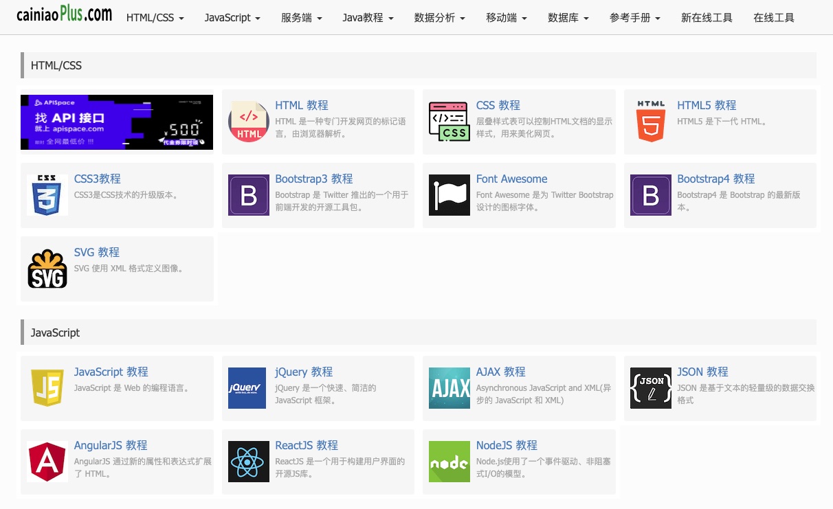 菜鸟教程(http://www.cainiaoplus.com)是编程技术基础教程的加强版,是软件开发工程师必备的参考教程和手册,涵盖了HTML、CSS、JavaScript、NodeJS、SQL、Python、PHP、Bootstrap、Java、SpringBoot、SpringCloud、XML、C++、Linux、Docker等诸多在线实例,助您享受学习编程的乐趣。
