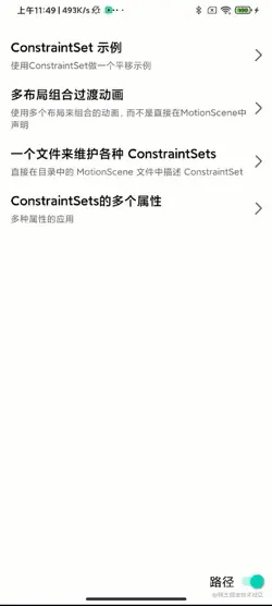 上面的例子中,我们使用了两个XML+一个原有的布局为基础,进行的修改。最终重用您可能已经拥有的布局。MotionLayout 还支持直接在目录中的 MotionScene 文件中描述 ConstraintSet res/xml。