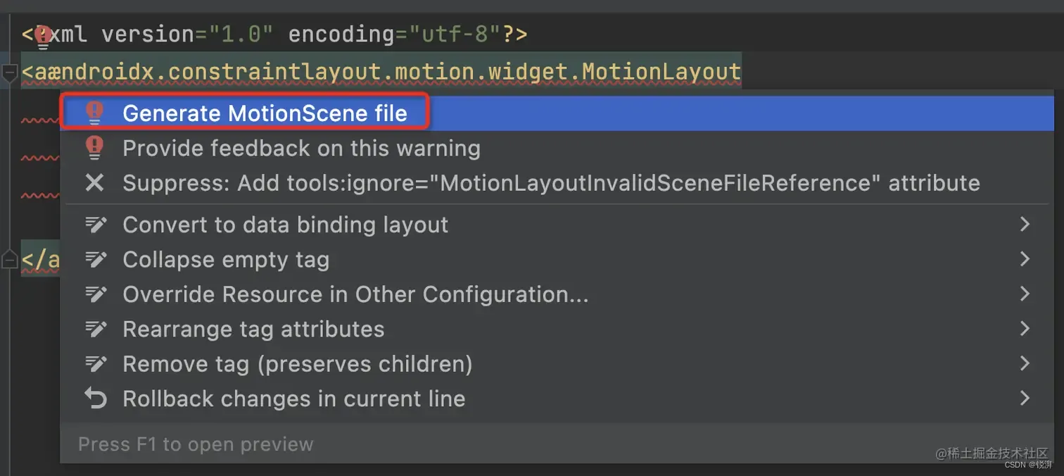 在第5点中,我们新建了一个xml,我们继续使用,不过需要将androidx.constraintlayout.widget.ConstraintLayout修改为androidx.constraintlayout.motion.widget.MotionLayout