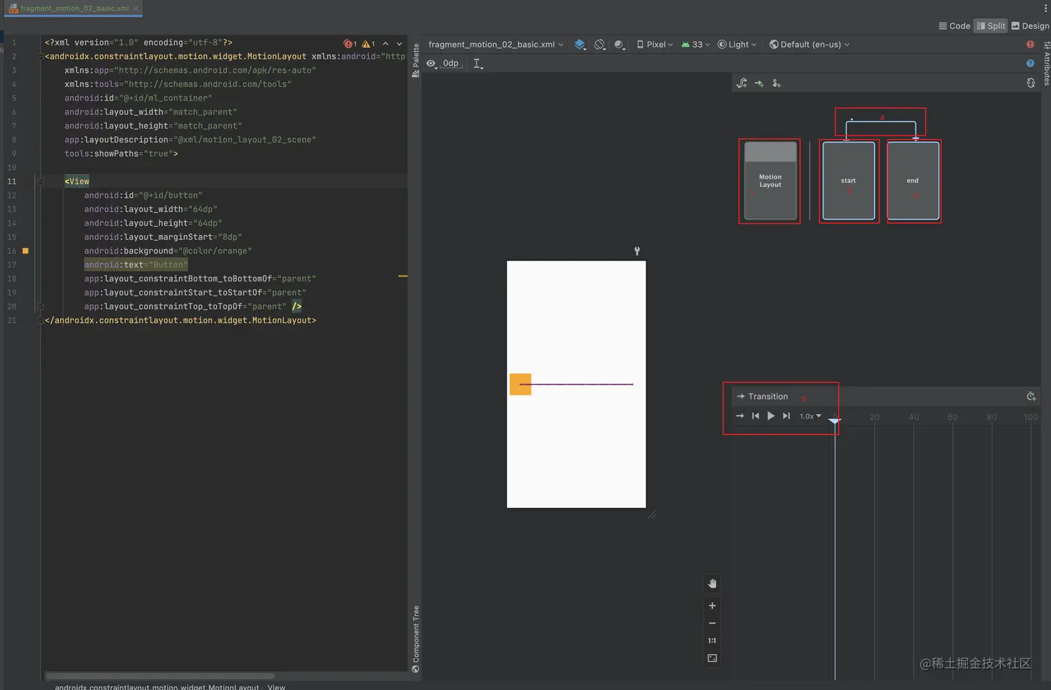 MotionScene定义和之前是相同的,但是我们将开始和结束 ConstraintSet 的定义直接放在文件中。与普通布局文件的主要区别在于我们不指定此处使用的View的类型,而是将约束作为元素的属性。