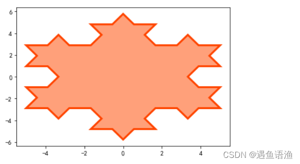 import numpy as np import matplotlib.pyplot as plt def koch_snowflake(order, scale=10): def _koch_snowflake_complex(order): if order == 0: # 初始三角形 angles = np.array([0, 120, 240]) + 90 return scale / np.sqrt(3) * np.exp(np.deg2rad(angles) * 1j) else: ZR = 0.5 - 0.5j * np.sqrt(3) / 3 p1 = _koch_snowflake_complex(order - 1) # 起点 p2 = np.roll(p1, shift=-1) # 终点 dp = p2 - p1 # 连接向量 new_points = np.empty(len(p1) * 4, dtype=np.complex128) new_points[::4] = p1 new_points[1::4] = p1 + dp / 3 new_points[2::4] = p1 + dp * ZR new_points[3::4] = p1 + dp / 3 * 2 return new_points points = _koch_snowflake_complex(order) x, y = points.real, points.imag return x, y x, y = koch_snowflake(order=2) fig = plt.figure() ax = fig.add_subplot(111) ax.fill(x, y, facecolor='lightsalmon', edgecolor='orangered', linewidth=3) plt.show()