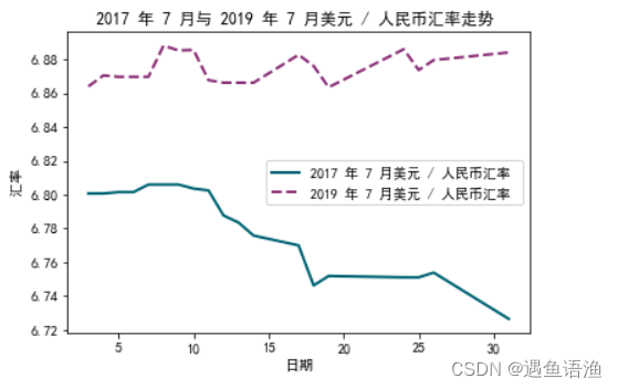 讯享网import numpy as np import matplotlib.pyplot as plt plt.rcParams["font.sans-serif"] = ["SimHei"] plt.rcParams["axes.unicode_minus"] = False # 汇率 eurcny_2017 = np.array([6.8007, 6.8007, 6.8015, 6.8015, 6.8060, 6.8060, 6.8060, 6.8036, 6.8025, 6.7877, 6.7835, 6.7758, 6.7700, 6.7463, 6.7519, 6.7511, 6.7511, 6.7539, 6.7265]) eurcny_2019 = np.array([6.8640, 6.8705, 6.8697, 6.8697, 6.8697, 6.8881, 6.8853, 6.8856, 6.8677, 6.8662, 6.8662, 6.8662, 6.8827, 6.8761, 6.8635, 6.8860, 6.8737, 6.8796, 6.8841]) date_x = np.array([3, 4, 5, 6, 7, 8, 9, 10, 11, 12, 13, 14, 17, 18, 19, 24, 25, 26, 31]) fig = plt.figure() ax = fig.add_subplot(111) # 第 1 条折线 : 湖绿色 , 实线 , 线宽为 2 ax.plot(date_x, eurcny_2017, color='#006374', linewidth=2, label='2017 年 7 月美元 / 人民币汇率 ') # 第 2 条折线 : 紫色 , 长虚线 , 线宽为 2 ax.plot(date_x, eurcny_2019, color='#8a2e76', linestyle='--', linewidth=2, label='2019 年 7 月美元 / 人民币汇率 ') ax.set_title('2017 年 7 月与 2019 年 7 月美元 / 人民币汇率走势 ') ax.set_xlabel(' 日期 ') ax.set_ylabel(' 汇率 ') ax.legend() plt.show()