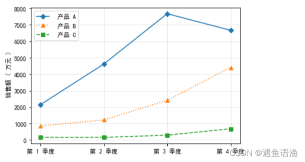 import numpy as np import matplotlib.pyplot as plt plt.rcParams["font.sans-serif"] = ["SimHei"] plt.rcParams["axes.unicode_minus"] = False sale_a = [2144, 4617, 7674, 6666] sale_b = [853, 1214, 2414, 4409] sale_c = [153, 155, 292, 680] fig = plt.figure() ax = fig.add_subplot(111) # 绘制具有不同线条样式的折线图 ax.plot(sale_a, 'D-', sale_b, '^:', sale_c, 's--') ax.grid(alpha=0.3) ax.set_ylabel(' 销售额 ( 万元 )') ax.set_xticks(np.arange(len(sale_c))) ax.set_xticklabels([' 第 1 季度 ',' 第 2 季度 ', ' 第 3 季度 ', ' 第 4 季度 ']) ax.legend([' 产品 A',' 产品 B',' 产品 C']) plt.show()