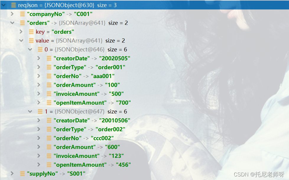 private static String getJsonData() { return "{\n" + " \"companyNo\": \"C001\",\n" + " \"supplyNo\": \"S001\",\n" + " \"orders\": [\n" + " {\n" + " \"orderNo\": \"aaa001\",\n" + " \"orderType\": \"order001\",\n" + " \"orderAmount\": \"100\",\n" + " \"creatorDate\": \"\",\n" + " \"invoiceAmount\": \"500\",\n" + " \"openItemAmount\": \"700\"\n" + " },\n" + " {\n" + " \"orderNo\": \"ccc002\",\n" + " \"orderType\": \"order002\",\n" + " \"orderAmount\": \"600\",\n" + " \"creatorDate\": \"\",\n" + " \"invoiceAmount\": \"123\",\n" + " \"openItemAmount\": \"456\"\n" + " }\n" + " ]\n" + "}"; }