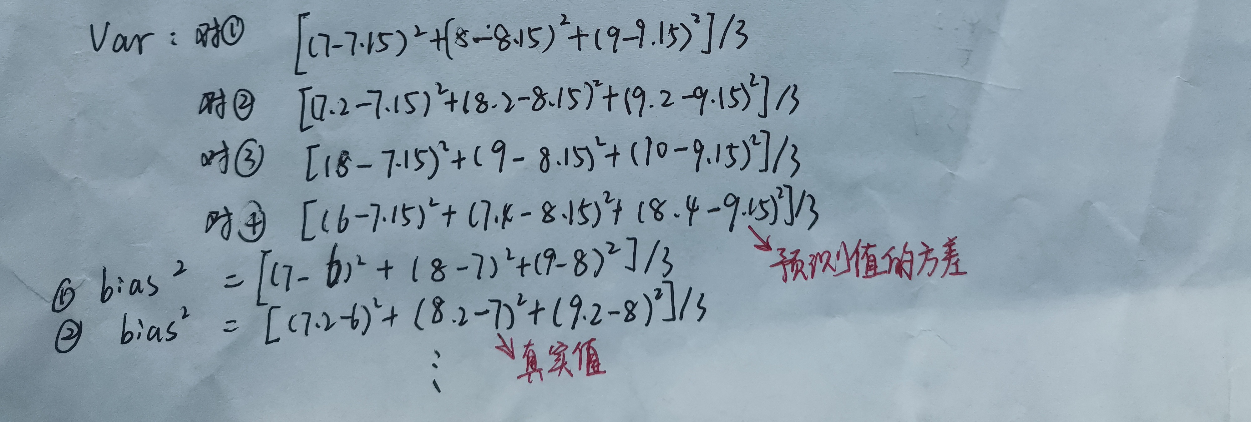 对于偏差和方差,可以估算。一个模型,使用不同的数据集进行建模,在测试集上进行测试,得到一系列的预测值,预测值的方差就是要求的方差,预测值的均值与真实值的差距是偏差。