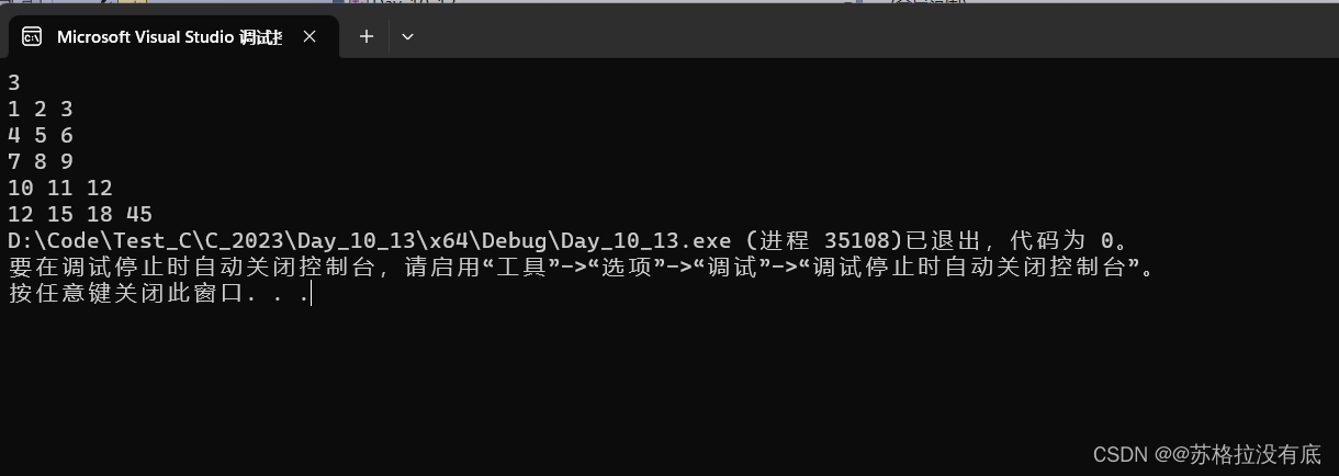 #include <stdio.h> int main() { int day; scanf("%d", &day); int sum1 = 0, sum2 = 0, sum3 = 0; while (day--) { //1 2 3\n //4 5 6\n //7 8 9\n //10 11 12\n // scanf("%d %d %d\n") //第一次输入 1 2 3\n(这里的/n会按照非输入字符处理)所以换行之后会让我们继续输入,事实上这里第一次回车之后 //我们输入\n,就会正常结束,但是这里我们继续输入4 5 6\n(这里的\n是scnaf()函数的结束标志); //拿走1 2 3,剩下4 5 6\n;因为前面是%d,所以会拿走3个%d的数字,并没有拿走\n。\n是被当作非输入字符串处理 //第二次输入 7 8 9\n,缓冲区放的是4 5 6\n 7 8 9\n //拿走4 5 6\n ,剩下7 8 9\n //第三次输入10 11 12\n,缓冲区放的是 7 8 9\n 10 11 12\n //拿走7 8 9\n,剩下10 11 12\n int ydj, edj, sdj; scanf("%d %d %d\n", &ydj, &edj, &sdj); sum1 = sum1 + ydj; sum2 = sum2 + edj; sum3 = sum3 + sdj; } int a, b, c; //缓冲区剩下下10 11 12\n 在按一次回车,缓冲区是10 11 12\n\n //拿走10 11 12\n,缓冲区剩下\n scanf("%d %d %d", &a, &b, &c); printf("a= %d b = %d c = %d\n", a, b, c); printf("%d %d %d %d\n", sum1, sum2, sum3, sum1 + sum2 + sum3); //测试缓冲区剩下的数据 char ch = getchar(); if (ch == '\n') { printf("hhhhh\n"); } //输入a printf("请继续输入"); char hh = getchar(); //输出97,说明之前的缓冲区没有数据了 printf("hh =%d\n", hh); return 0; }运行截图