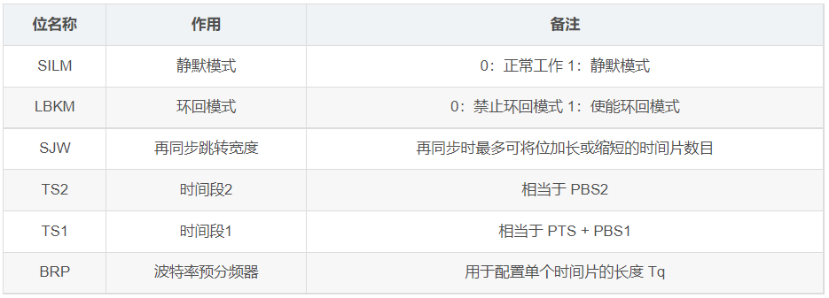 ⏩ 位时序寄存器CAN_BTR:用于配置测试模式、波特率以及各种位内的段参数