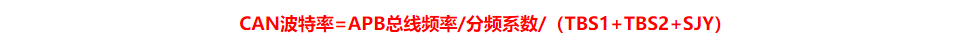 CAN波特率的计算公式:只需要知道BS1和BS2的设置,以及APB1的时钟频率,就可以方便的计算出波特率。比如设置TS1=9、TS2=5和BRP=6,在APB1频率为45Mhz的条件下,即可得到CAN通信的波特率=45000/6/(5+9+1)=500Kbps
