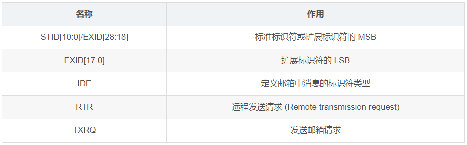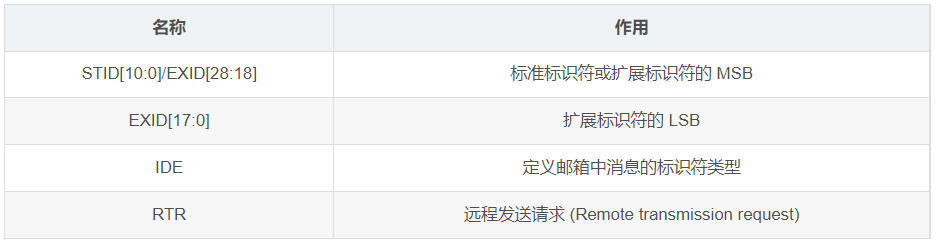 当使用CAN外设发送报文时,需要把报文的各个段分解,按位置写入到这些寄存器中,并对标识符寄存器CAN_TIxR中的发送请求寄存器位TMIDxR_TXRQ置1,即可把数据发送出去。其中标识符寄存器CAN_TIxR中的STDID寄存器位比较特别。我们知道CAN的标准标识符的总位数为11位,而扩展标识符的总位数为29位的。当报文使用扩展标识符的时候,标识符寄存器CAN_TIxR中的STDID[10:0]等效于EXTID[18:28]位,它与EXTID[17:0]共同组成完整的29位扩展标识符