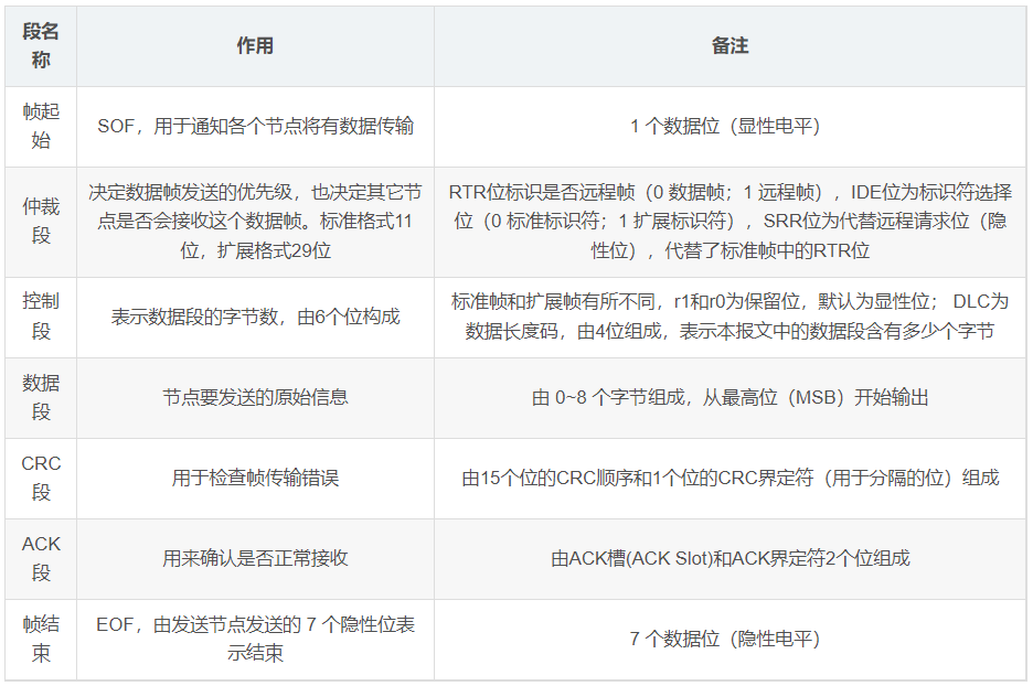 数据帧的结构:数据帧是在CAN通讯中最主要、最复杂的报文,它的结构如下图