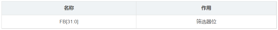 每组筛选器包含2个32位的寄存器,分别为CAN_FxR1和CAN_FxR2,它们用来存储要筛选的ID或掩码,各个寄存器位代表的意义与图中两个寄存器下面“映射”的一栏一致,各个模式的说明见表