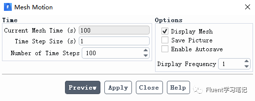 在Task Page页面单击Preview Mesh Motion,设置时间步数为100,时间步长为1s,显示频率为1。
