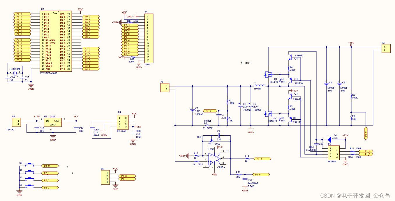 1、采用STC12C5A60S2单片机发生47KHZ的PWM脉冲信号,经过IR2104控制MOS,从而控制整个BUCK(降压式变换)电路;