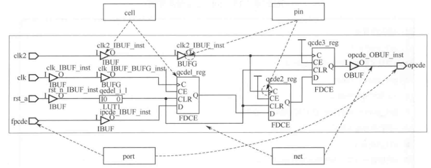 网表中有5类重要的对象,分别为模块(cell)、引脚(pin)、网线(net)、端口(port)和时钟(clock)。如下图所示,这里注意pin和port的区别。这5类对象构成了网表中的基本对象,也是在描述约束以及编辑网表时不可避免地会查找或引用的对象。