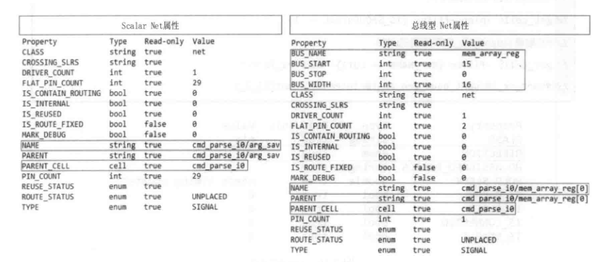 net的属性如下图所示,这里分别列出了Scalar net(位宽为1)和总线型net(位宽大于1)的属性。对于Scalar net,BUS_NAME的属性值为空。通过get_nets可以获取目标net。