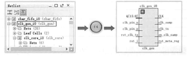 如下图所示,在netlist窗口中选中模块clk_gen_i0,按下F4键即可显示该模块的网表视图;或者在Tcl console中输入Tcl命令get_selected_objects,则输出clk_gen_i0,即选中对象的名字。这种方法对于获取对象名称很有帮助。