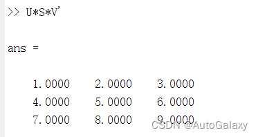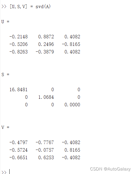 奇异值和零空间矩阵 A 奇异值分解如下 反向验证分解的正确性 S 对角线的元素就是奇异值的 3 个值 零空间则是指 Ax 0 时 x 的取值 有几个基础解析就代表这个零空间有几个维度 如上图 秩为 2 因此基础解析个数为 3 2 1 因此零空间中只有一个基础解析