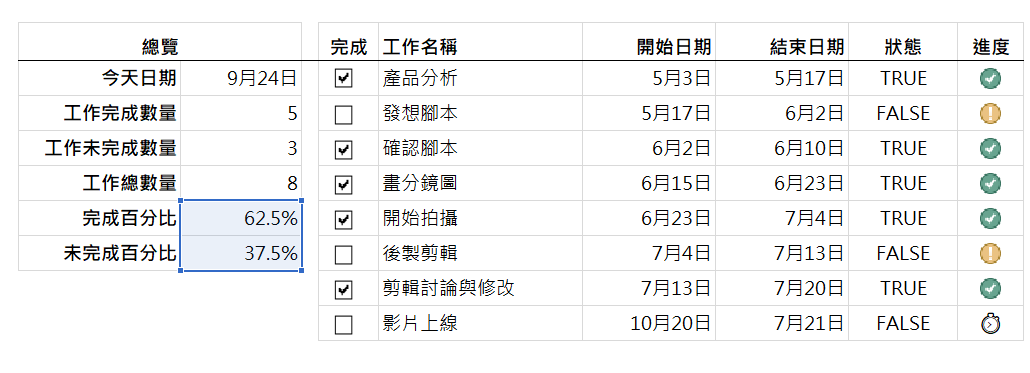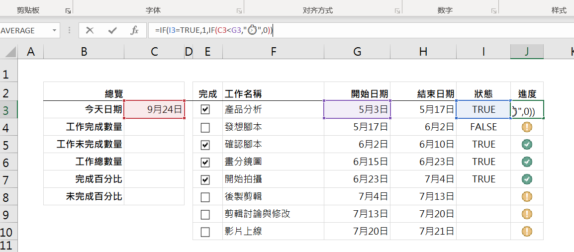 为还未开始的计划添加时钟图标 ,所以先用today函数获取今天日期,再与开始日期进行比较,如果超过了开始日期,则正常输出;如果未超过开始日期,代表还没开始,输出时间图标(win+;可以调出表情栏)