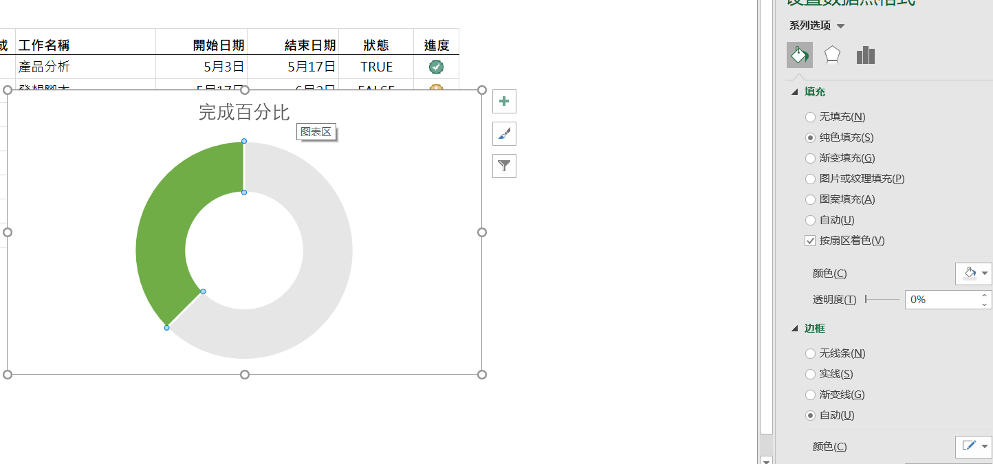 框选两个百分比-插入-圆环图,右键圆环-设置数据系列格式可以更改图表元素,改变颜色