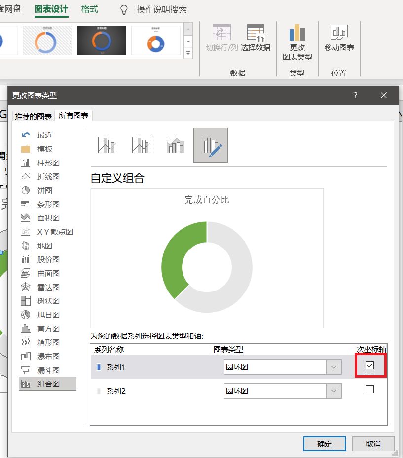 让两个环形图上下重叠:设计-更改图表类型-勾选次坐标轴