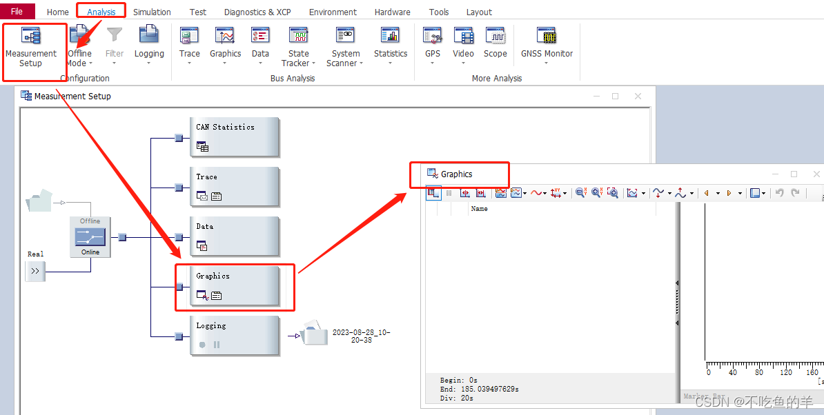 日志文件保存设置:打开”Analysis”下的”Measurement Setup”,右键上图红框中的”Logging”,点击”Logging File Configuration”。此时界面如下图,在这里进行日志文件的保存设置。