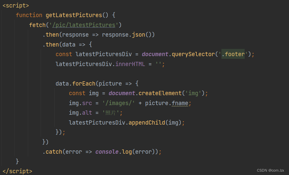 String picturePath = "/images/" + p.getFname(); String userName = userService.getUserNameById(p.getUserId()); Date uploadTime = p.getUploadTime(); PictureInfo pictureInfo = new PictureInfo(picturePath, userName, uploadTime); pictureInfoList.add(pictureInfo); } } model.addAttribute("user", user); model.addAttribute("pictures", pictureInfoList); model.addAttribute("page", page); //将当前页码传递给页面 return "home"; } / * 获取最新照片 * * @return */ @GetMapping("/latestPictures") @ResponseBody public List<Picture> getLatestPictures() {