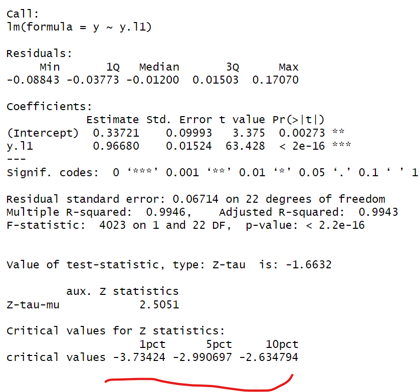 ```{r} library(urca) pp.x <- ur.pp(x, type="Z-tau", model="constant", lags="short") summary(pp.x) pp.x <- ur.pp(x, type="Z-tau", model="trend", lags="short") summary(pp.x) ```