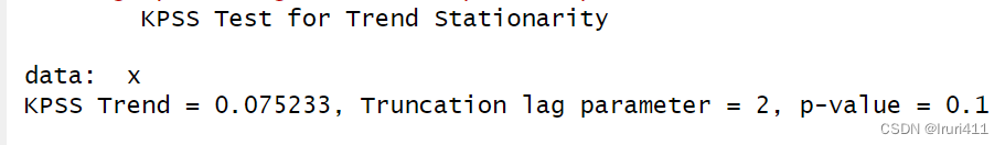 讯享网```{r} library(tseries) kpss.test(x, null = "Level", lshort = TRUE) kpss.test(x, null = "Trend", lshort = TRUE) ```