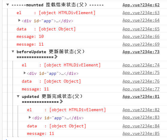 mounted: function() { console.group('------mounted 挂载结束状态(父)------'); console.log("%c%s", "color:red","el : " + this.$el); console.log(this.$el); console.log("%c%s", "color:red","data : " + this.$data); console.log("%c%s", "color:red","message: " + this.message); this.message += 1 console.log("%c%s", "color:red","message: " + this.message); }, beforeUpdate: function () { console.group('beforeUpdate 更新前状态(父)===============》'); console.log("%c%s", "color:red","el : " + this.$el); console.log(this.$el); console.log("%c%s", "color:red","data : " + this.$data); console.log("%c%s", "color:red","message: " + this.message); this.message += 1 console.log("%c%s", "color:red","message: " + this.message); }