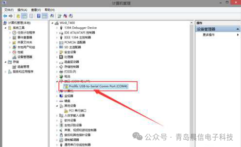 4、安装完成之后,再次找到设备管理器,找到PL2303的驱动,右键更新