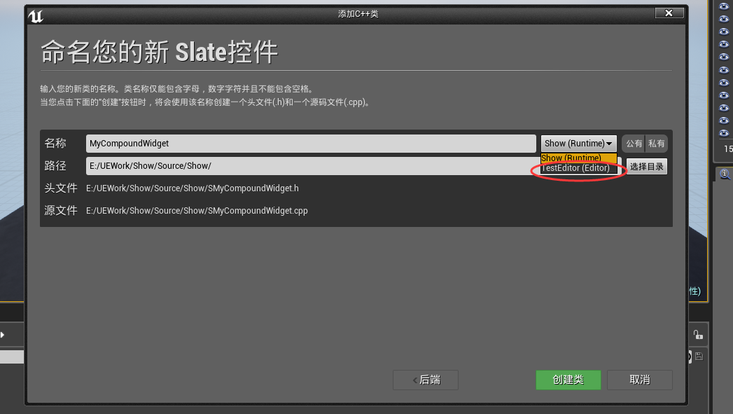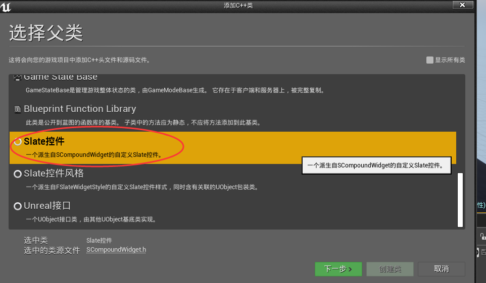 4. 使用。创建继承自SCompoundWidge的类。使用引擎的 文件->新建C++类 创建。