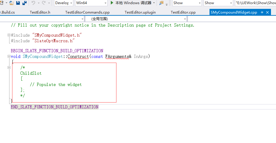 讯享网 TSharedRef<SDockTab> FTestEditorModule::OnSpawnPluginTab(const FSpawnTabArgs& SpawnTabArgs) { /*FText WidgetText = FText::Format( LOCTEXT("WindowWidgetText", "Add code to {0} in {1} to override this window's contents"), FText::FromString(TEXT("FTestEditorModule::OnSpawnPluginTab")), FText::FromString(TEXT("TestEditor.cpp")) );*/ //return SNew(SDockTab) // .TabRole(ETabRole::NomadTab) // [ // // Put your tab content here! // SNew(SBox) // .HAlign(HAlign_Center) // .VAlign(VAlign_Center) // [ // SNew(STextBlock) // .Text(WidgetText) // ] // ]; return SNew(SDockTab) .TabRole(ETabRole::NomadTab) [ // Put your tab content here! SNew(SMyCompoundWidget) ]; }