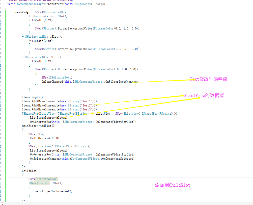 SCompundWidget经常被继承用来排版,期包括一个ChildSlot,再ChildSlot中构建SWidget