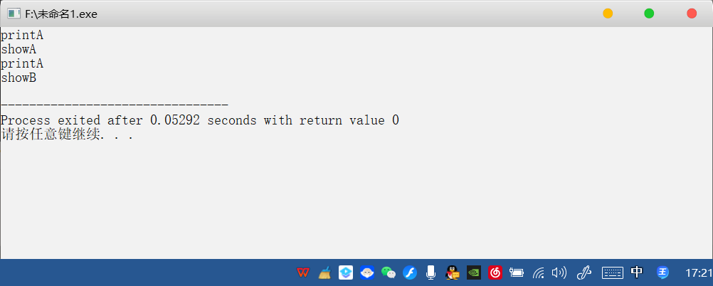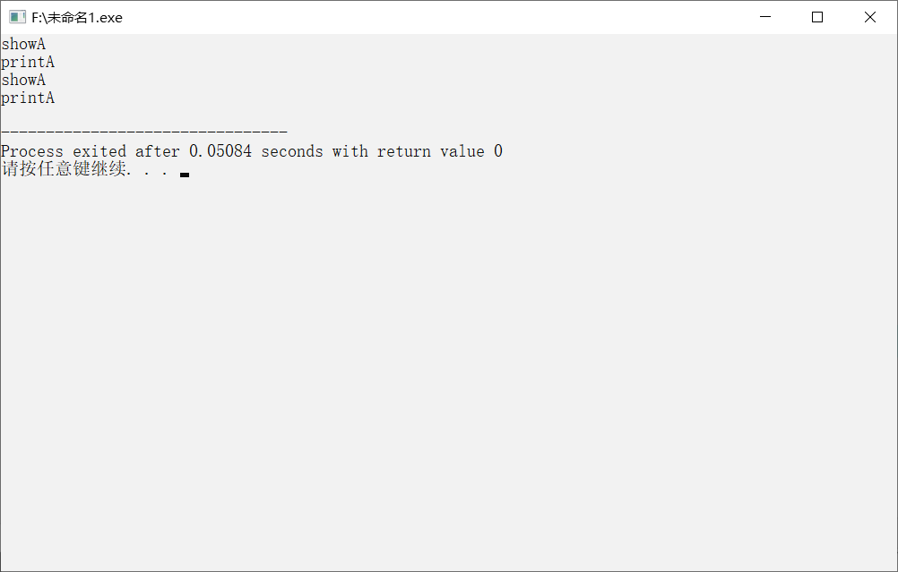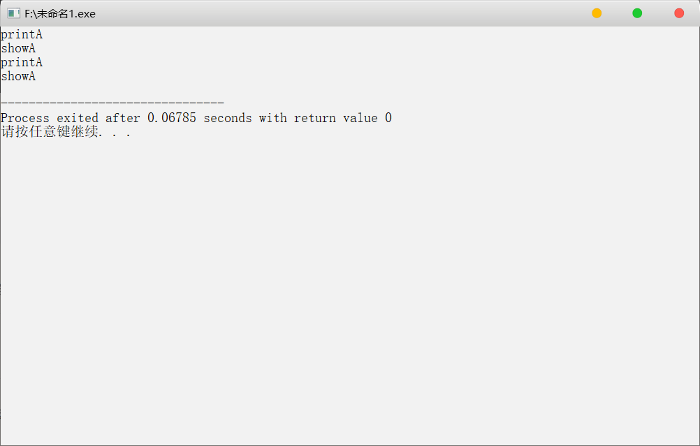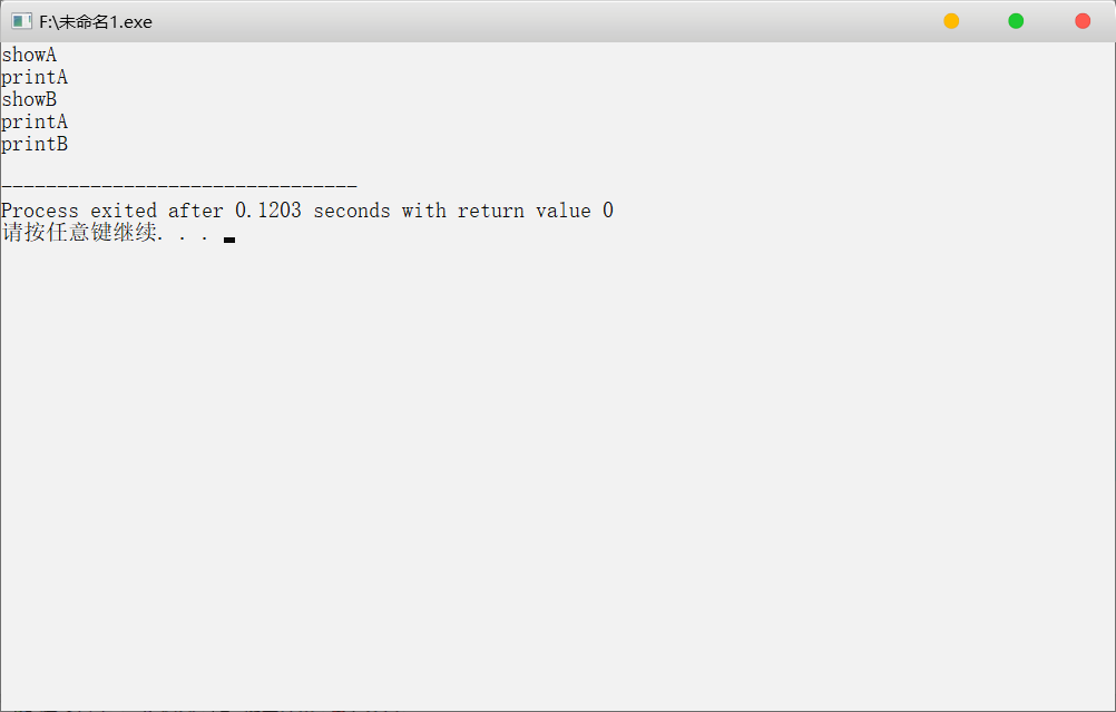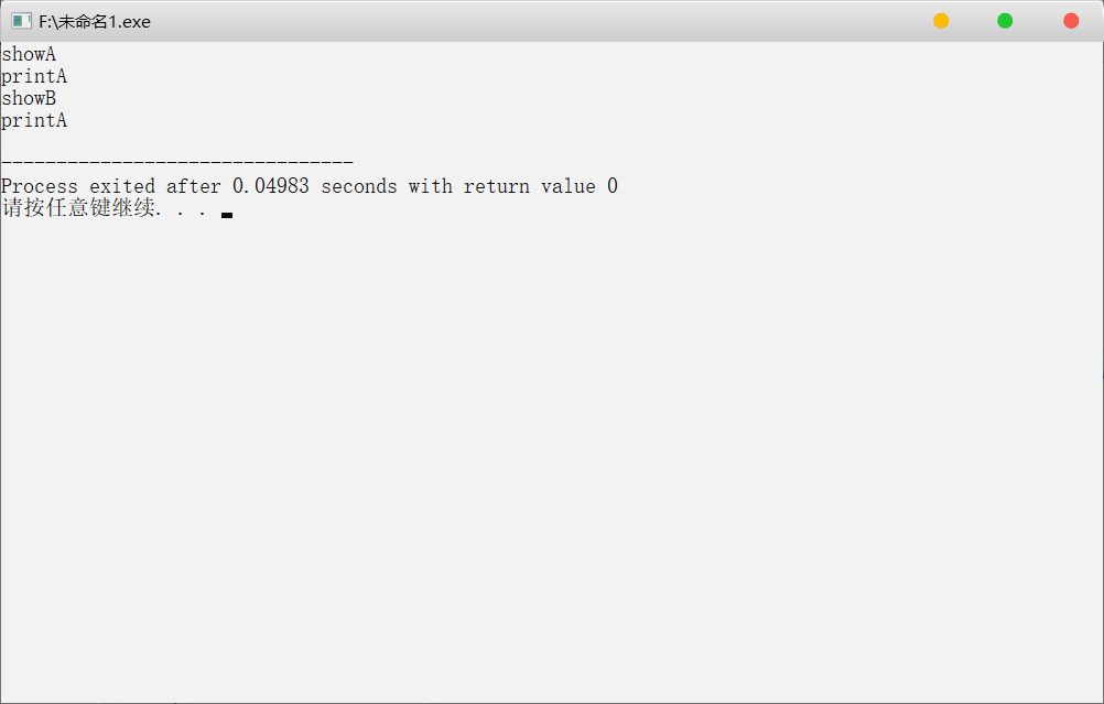 #include <iostream> using namespace std; class A {public: void show(){cout<<"showA"<<endl; } void printA(){cout<<"printA"<<endl; } } ; class B:public A {public: void show(){cout<<"showB"<<endl; } void printB(){cout<<"printB"<<endl; } } ; void f(A *p){p->show();p->printA(); //p->printB(); } int main() { A a; B b; f(&a);f(&b); //都是A类 return 0; }