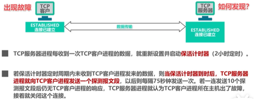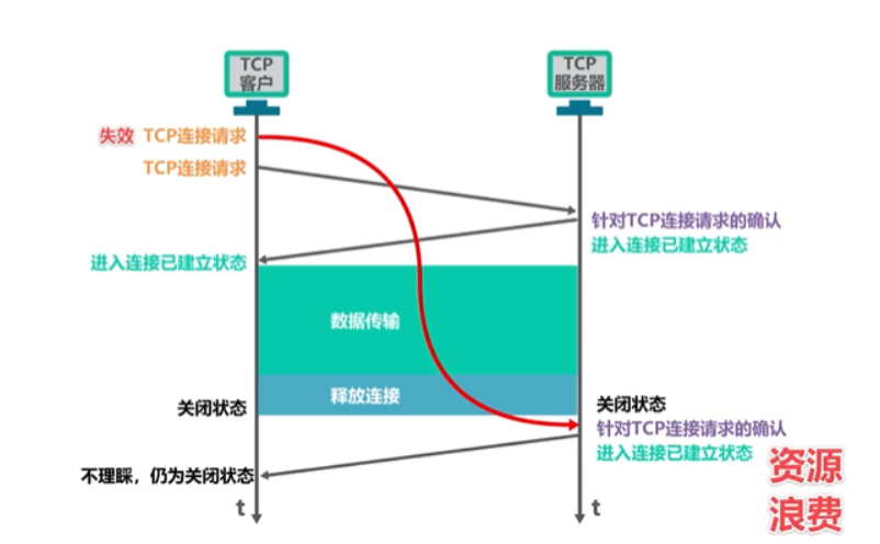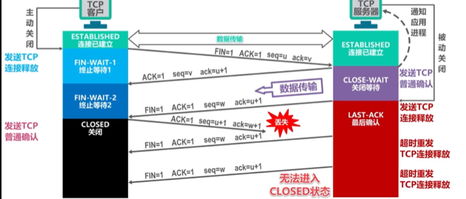 假如客户端最后发送的对服务器的确认报文段在网络中丢失了,服务器并没有收到来自客户端的确认报文段,然后继续向和客户端发送释放连接报文段,但是客户端已经关闭了,不在接收报文段,这就会导致服务器一直处于最后确认状态而不能关闭
