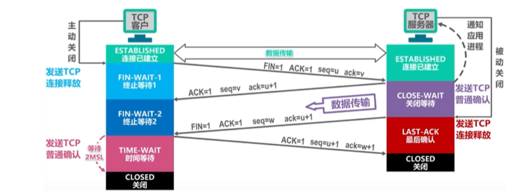 服务器没有数据后会向客户端发送一条TCP释放连接报文段,该报文段包括终止连接FIN=1、确认位ACK=1、序号位seq=w(w=当前服务器传输完数据之后的序号位)、ack=u+1。进入确认状态。