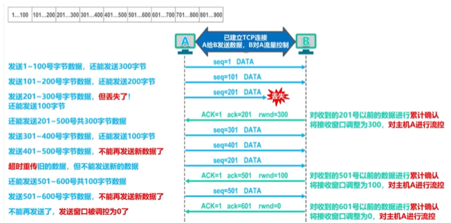 主机A向主机B传输数据,刚开始的接受窗口大小为400,一次最大发送的数据为100字节