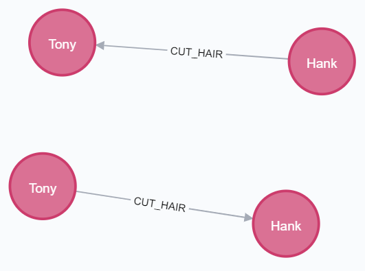 CREATE (tony:User {name: 'Tony'})-[r:CUT_HAIR]->(hank:User {name: 'Hank'}) return tony, hank; CREATE (tony:User {name: 'Tony'})<-[r:CUT_HAIR]-(hank:User {name: 'Hank'}) return tony, hank; CREATE (tony:User {name: 'Tony'})<-[:CUT_HAIR]-(hank:User {name: 'Hank'}) return tony, hank